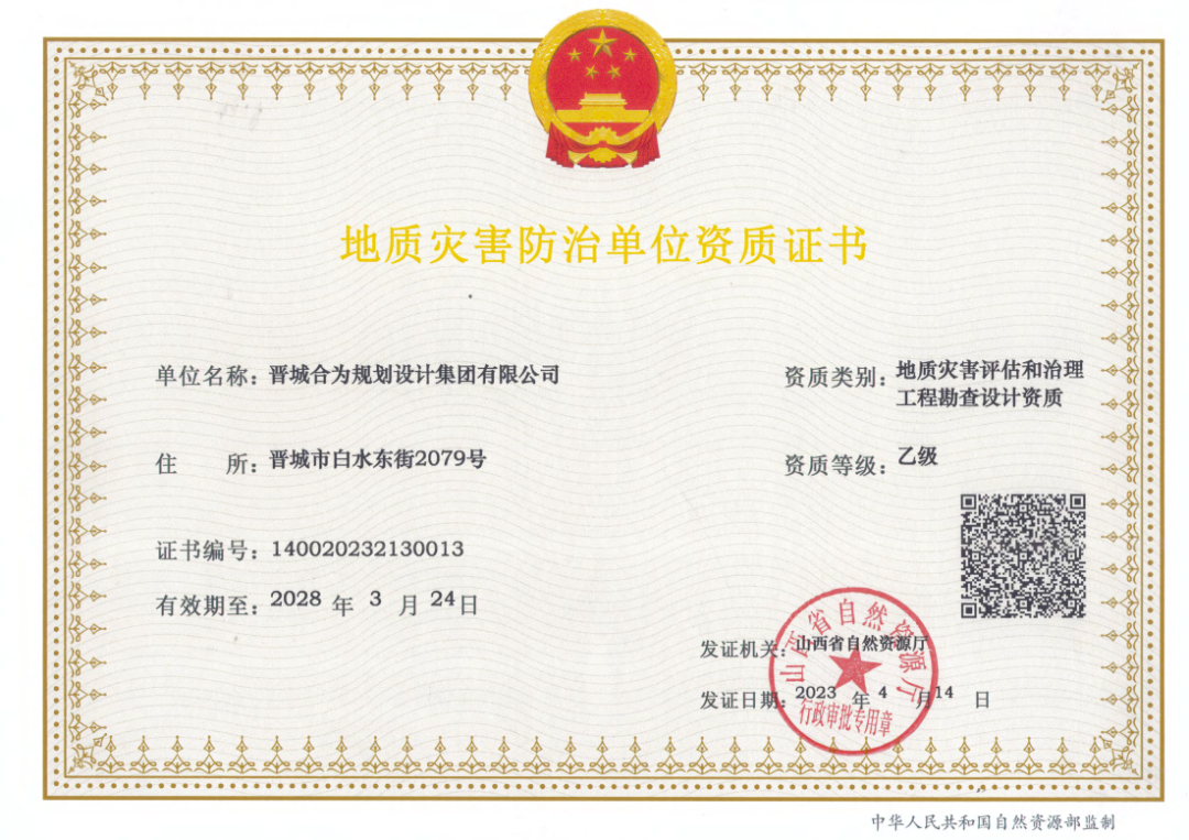 資質(zhì)證書的取得,為擦亮合為集團這張“金名片”再添新動力,對集團拓寬市場領(lǐng)域,彰顯品牌形象,增強綜合實力,提升市場競爭力具有十分重要的意義。今后可承擔中、小型地質(zhì)災(zāi)害評估和治理工程勘查設(shè)計業(yè)務(wù),為服務(wù)地質(zhì)災(zāi)害防治預(yù)警做好技術(shù)支撐。