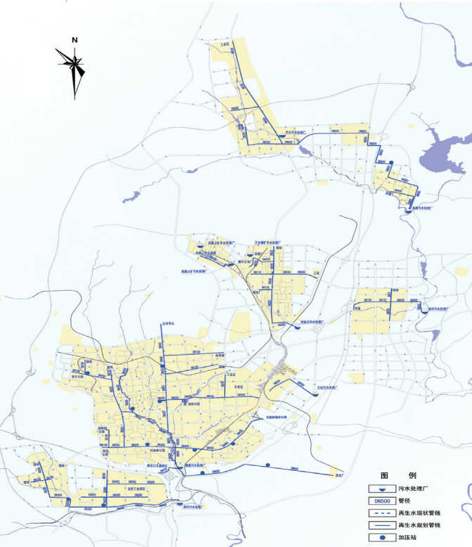 規(guī)劃采用雨污分流排水體制,舊城近期難以全面改造的應(yīng)利用現(xiàn)有設(shè)施采用截流式合流制,并逐漸向分流制過渡。根據(jù)晉城山地丘陵城市地形地貌,規(guī)劃按照河流水系分區(qū)采取組團(tuán)式獨(dú)立排水系統(tǒng),中心城市污水規(guī)劃為 5 個(gè)獨(dú)立的排水系統(tǒng),即主城區(qū)白水河流域排水系統(tǒng);金村區(qū)北石店河流域排水系統(tǒng)、北石店區(qū)排水系統(tǒng)、南村區(qū)申匠河流域排水系統(tǒng)、巴公、高都區(qū)污水排水系統(tǒng)。各排水系統(tǒng)均設(shè)污水處理廠,共規(guī)劃 8 座城市污水處理廠,雨水就近排入河流。規(guī)劃對(duì)污水再生資源化利用進(jìn)行了科學(xué)預(yù)測(cè),對(duì)再生水利用的方式與途徑進(jìn)行了合理規(guī)劃,將再生水管網(wǎng)布局與城市道路建設(shè)與改造相結(jié)合,同步實(shí)施,同步建設(shè)。