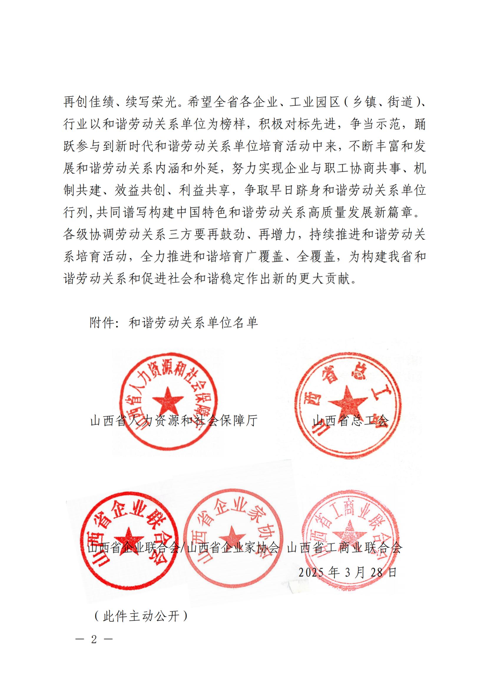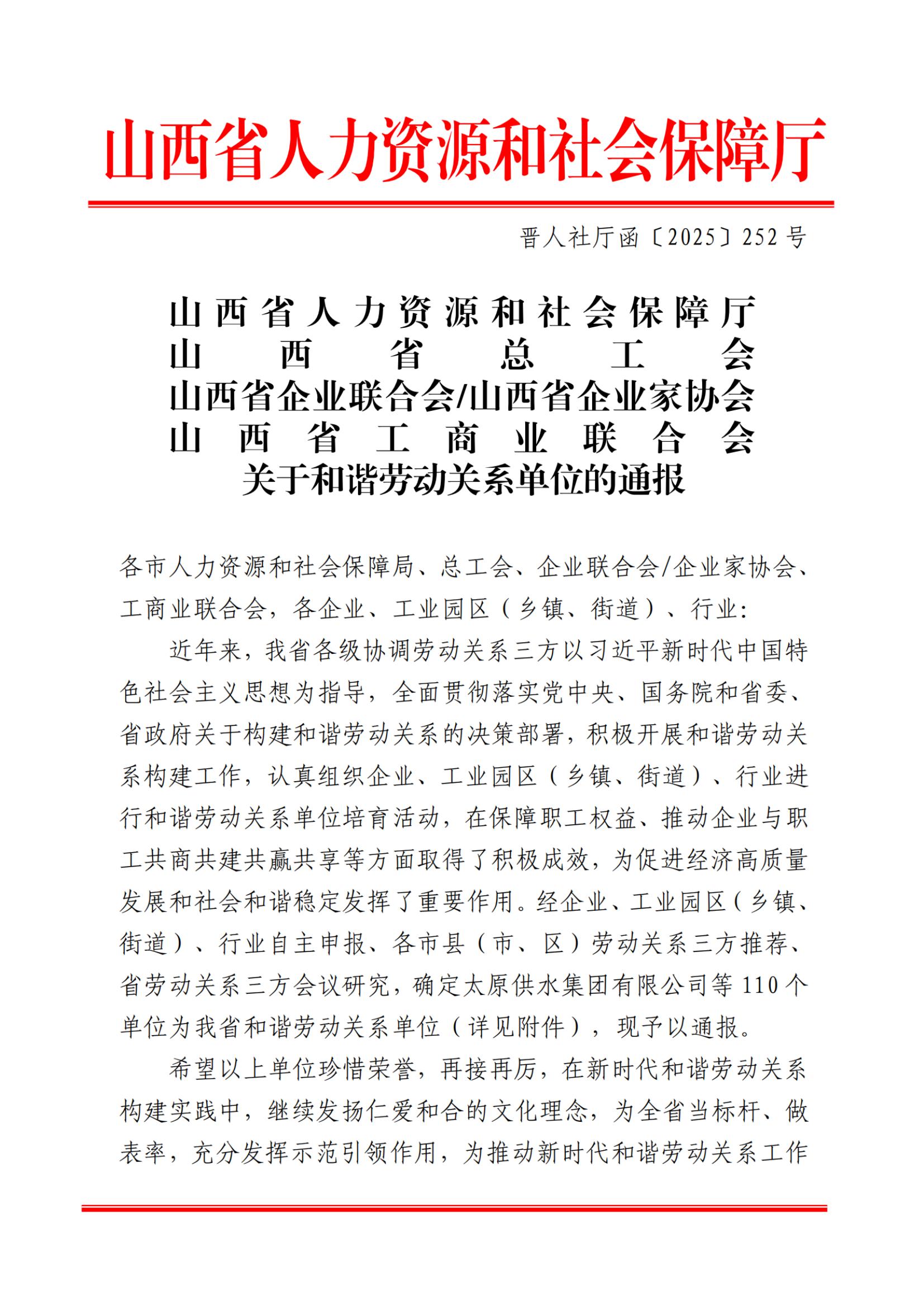 近日,山西省人社廳、山西省總工會等5部門聯(lián)合發(fā)布2025年山西省和諧勞動(dòng)關(guān)系單位名單,共有110個(gè)單位入選。集團(tuán)成為晉城四個(gè)和諧勞動(dòng)關(guān)系企業(yè)之一。